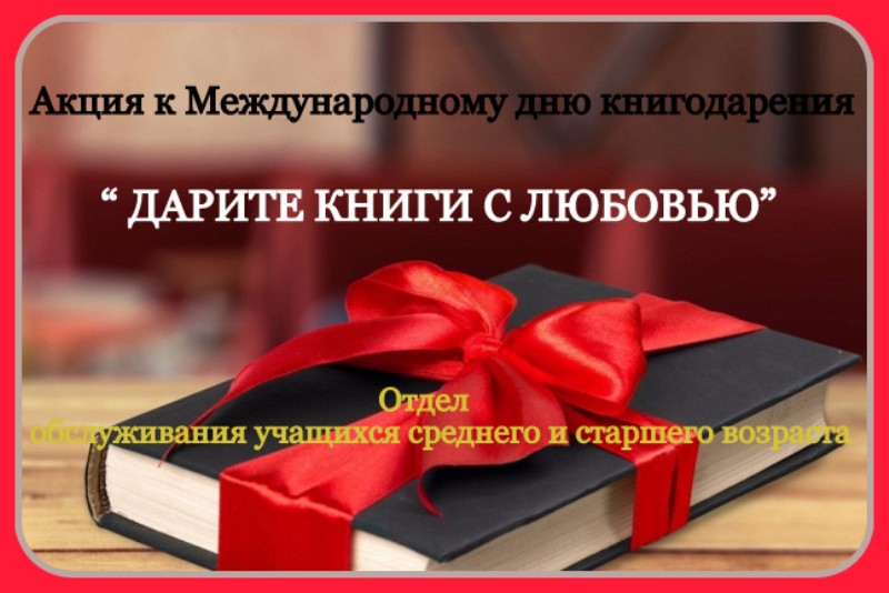 Отдел обслуживания учащихся среднего и старшего школьного возраста приглашает своих читателей и всех неравнодушных луганчан принять участие в акции «Дарите книги с любовью», посвященной Международному дню дарения книг. Международный день книгодарения отмечается с 2012 года. В нем ежегодно принимают участие жители более 30 стран мира, включая Россию.